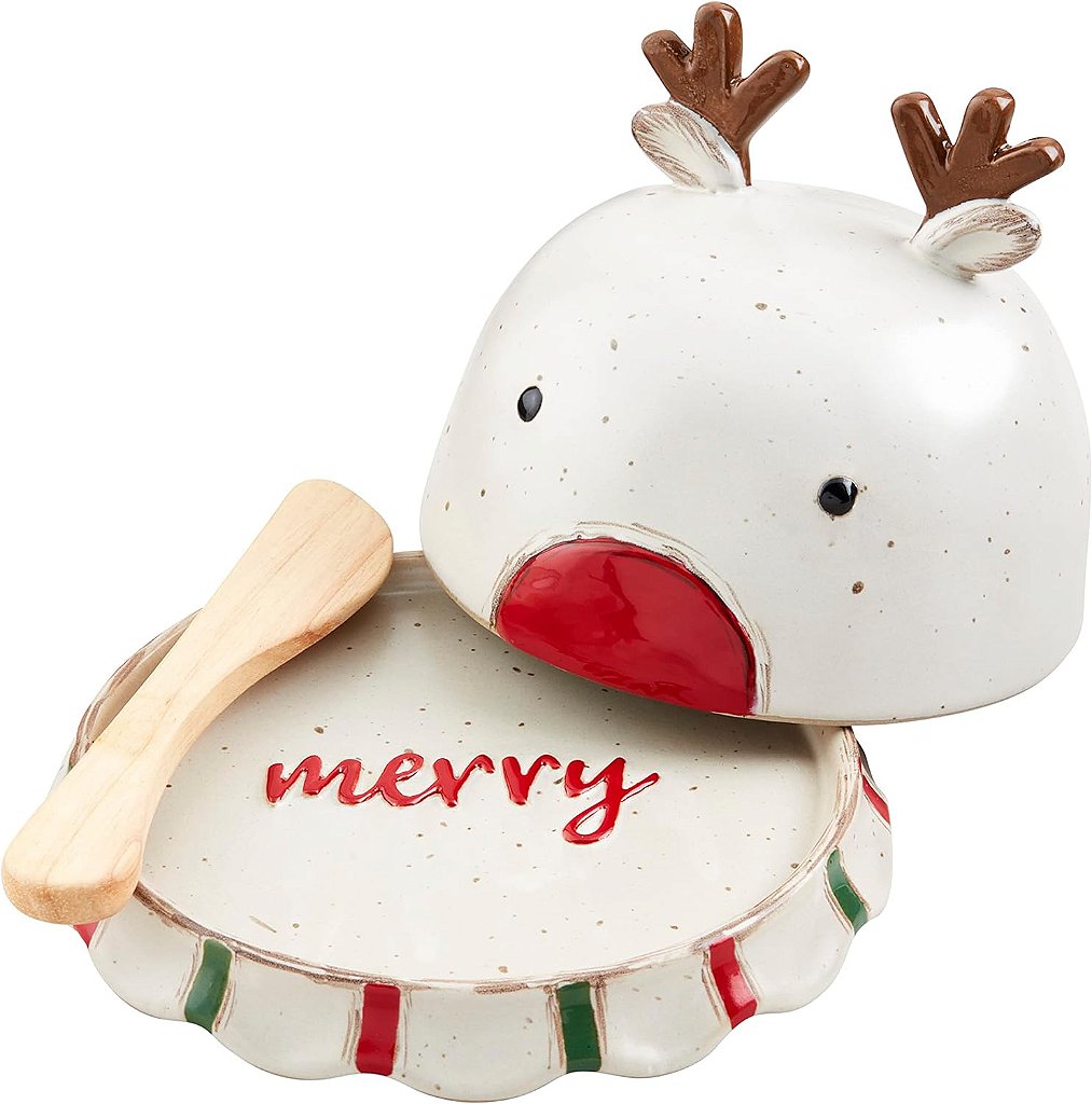 O Reindeer Butter Dish da Mud Pie é a peça funcional e decorativa perfeita para a sua cozinha. Este conjunto inclui duas peças: uma tampa em forma de rena e uma base. A tampa apresenta detalhes pintados à mão e chifres dimensionais de rena, além de vir com um espalhador de madeira. Medindo 7 x 6 x 4 polegadas e pesando 1,85 libras, este elegante conjunto é uma adição encantadora à sua mesa. Fabricado pela Mud Pie e originário da China, este produto está classificado como o número #390,536 em Cozinha e Jantar e #1,079 em Porta-Mante