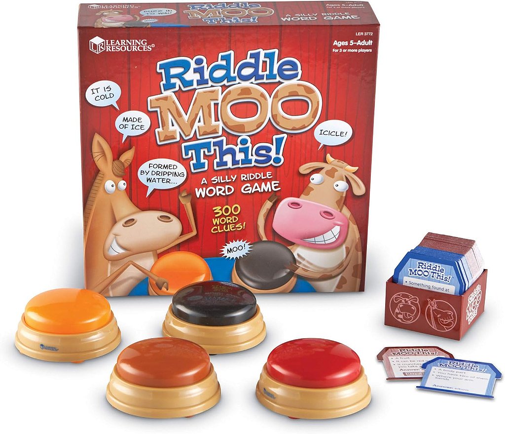 Recursos de Aprendizagem Riddle Moo This - Um Jogo Bobo de Adivinhas de Palavras, 150 Cartas, 4 Buzzers, Idade 5+, Vermelho