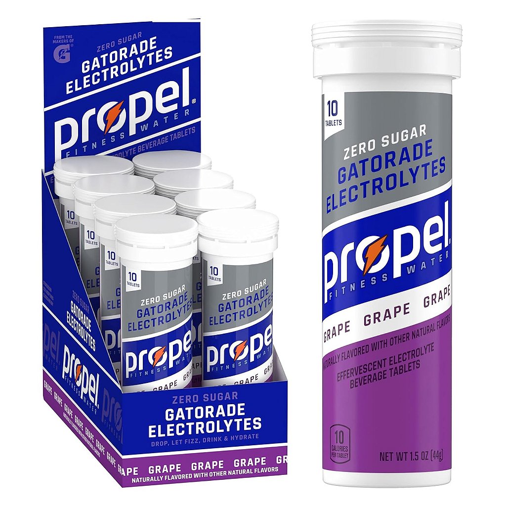 Obtenha a energia necessária para suas atividades diárias com os Propel Electrolyte Hydration Tablets da PepsiCo. Estes efervescentes comprimidos de bebida eletrolítica são feitos para repor e reidratar estilos de vida ativos, com a ajuda de eletrólitos, vitaminas e antioxidantes da Gatorade. São uma excelente fonte de vitaminas B3, B5, B6, B12 e E, e uma boa fonte de vitamina C antioxidante. Além disso, são baixos em calorias e adoçados com sucralose. Cada embalagem contém comprimidos de uva que vão proporcionar a energia e hidrata